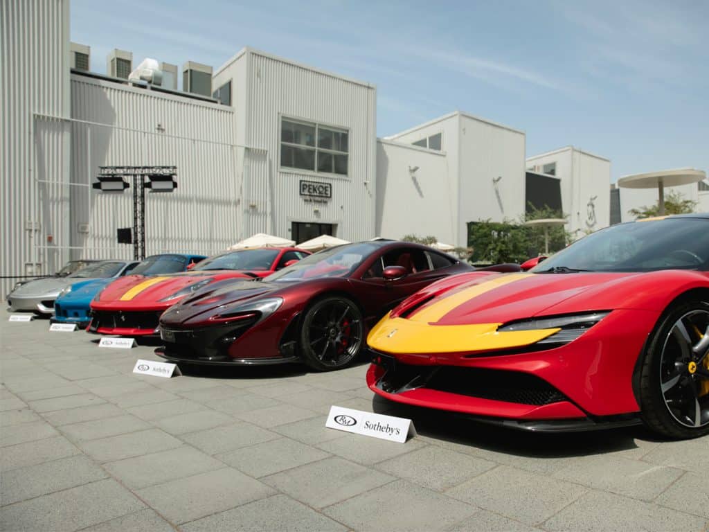 A selection of the sports cars on auction at RM Sotheby’s in Dubai, Alserkal Avenue. Photo credit: RM Sotheby’s.
